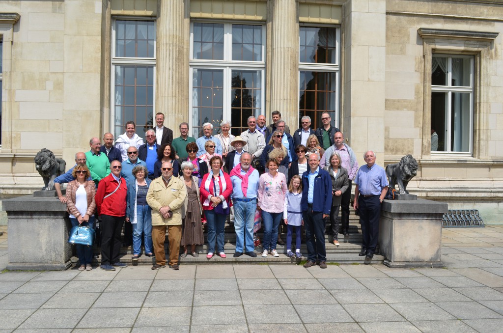 Jubiläums-Jumelage vom 30. Mai bis 1. Juni 2014: Ausflug zur Villa Hügel in Essen. Als Fotomotiv entschieden sich die Lions-Mitglieder bewusst nicht für den Haupteingang, sondern für die kleinere Treppe mit den flankierenden Löwen.